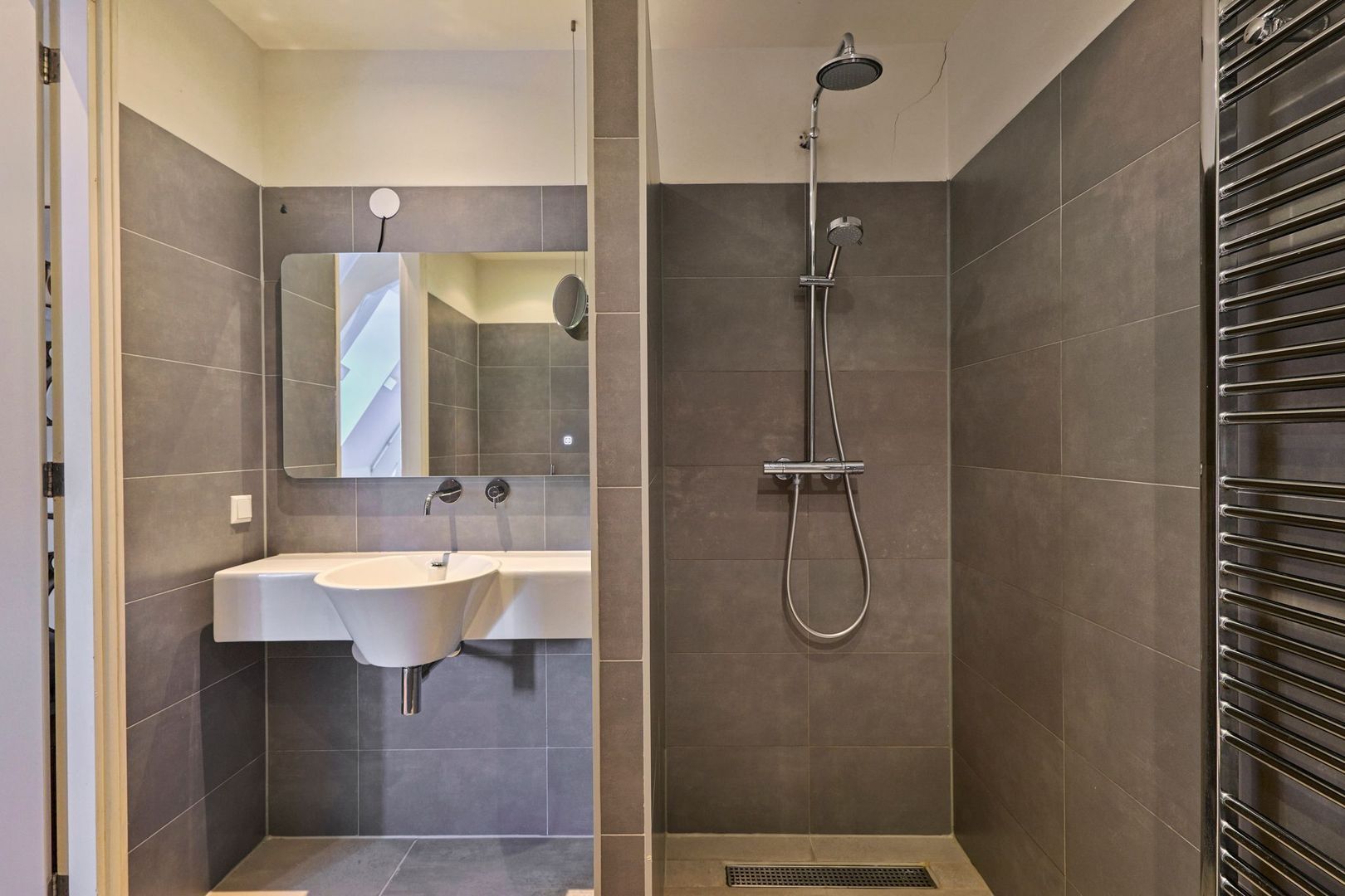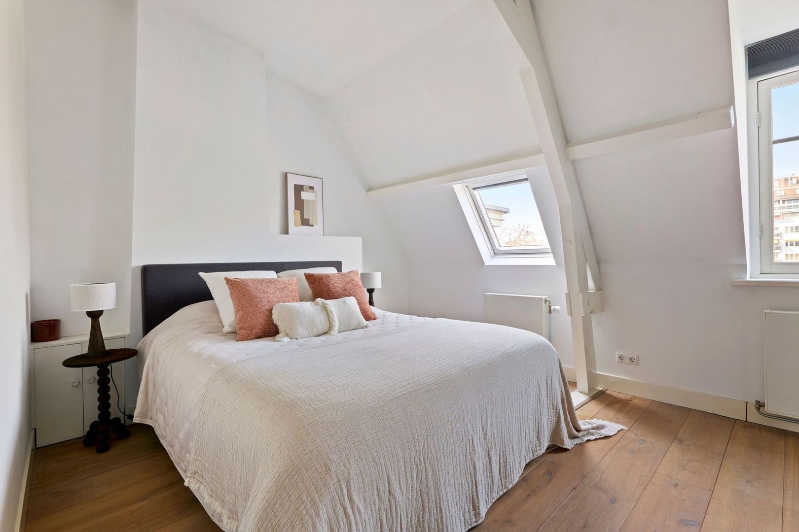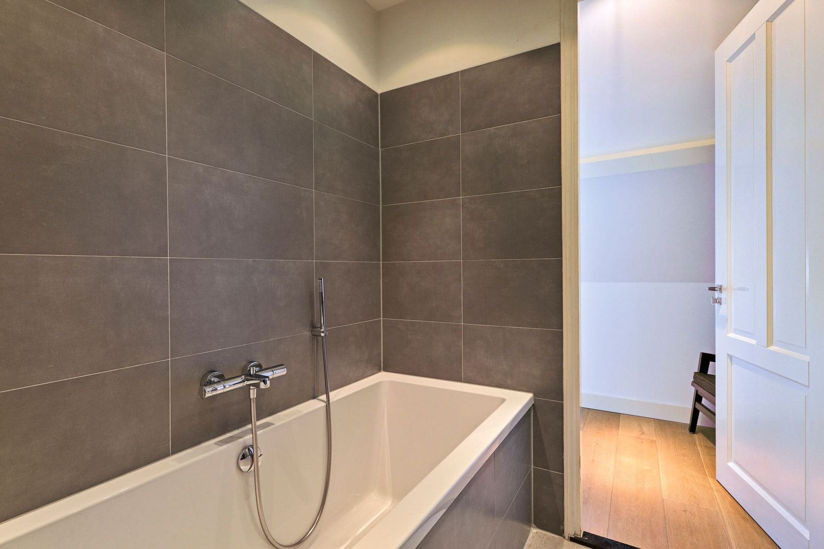 Aan de voorzijde is de slaapkamer gesitueerd, deze is prettig van formaat en biedt dan ook plaats voor een tweepersoonsbed en kledingkasten. Vanuit de slaapkamer is er prachtig zicht over het Vondelpark. De aansluitende badkamer is uitgevoerd met een antracietkleurige wand- en vloertegel. Hier vind je een heerlijk ligbad, een ruime inloopdouche en een wastafelmeubel.