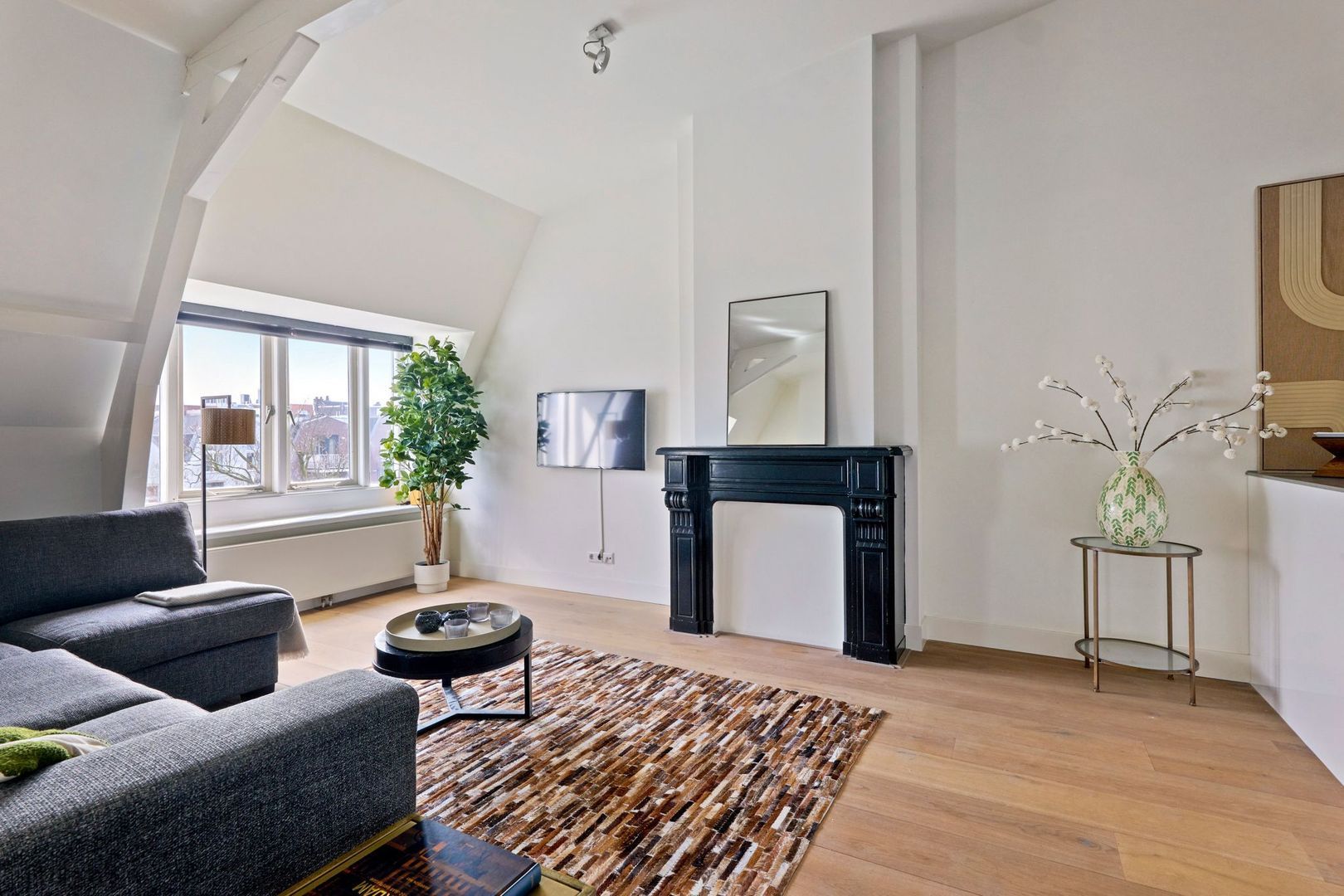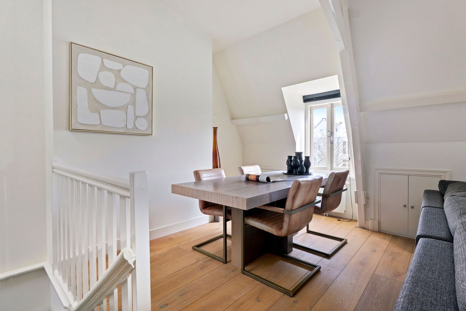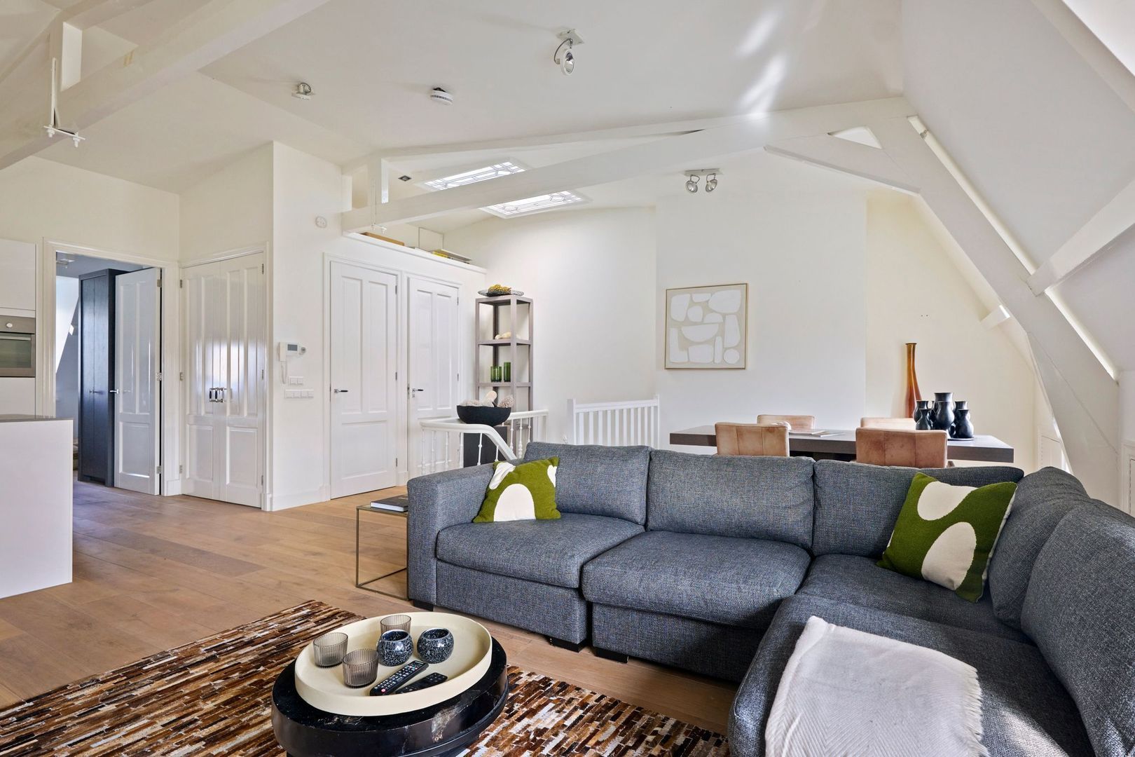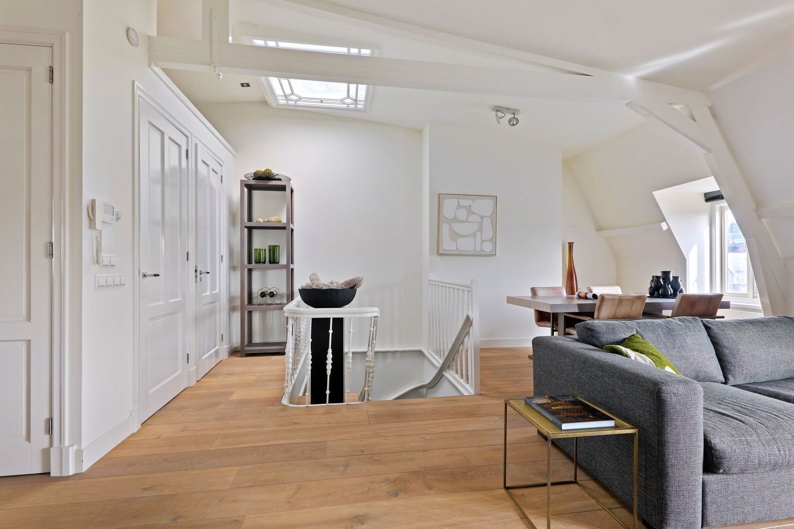 Via de gemeenschappelijke entree betreedt men de voorhal, voorzien van een marmeren vloer en klassieke paneelwanden, die leidt naar het keurige trappenhuis. De entree van het appartement bevindt zich op de derde verdieping vanwaar de interne, gestoffeerde trap naar de bovenste woonlaag leidt waar men direct de prachtige living betreedt. Deze haast loftachtige ruimte ligt aan de achterzijde van het pand en is onderverdeeld in een zitruimte, eetruimte en een open keuken. Een eye-catcher is de originele schouw maar ook zeker het glas in lood dakraam direct boven de open trap wat de ruimte van extra daglicht voorziet. Buiten de prettige oppervlakte biedt deze ruimte tevens toegang tot het separate toilet, een wasmachinekast en een inbouwkast.