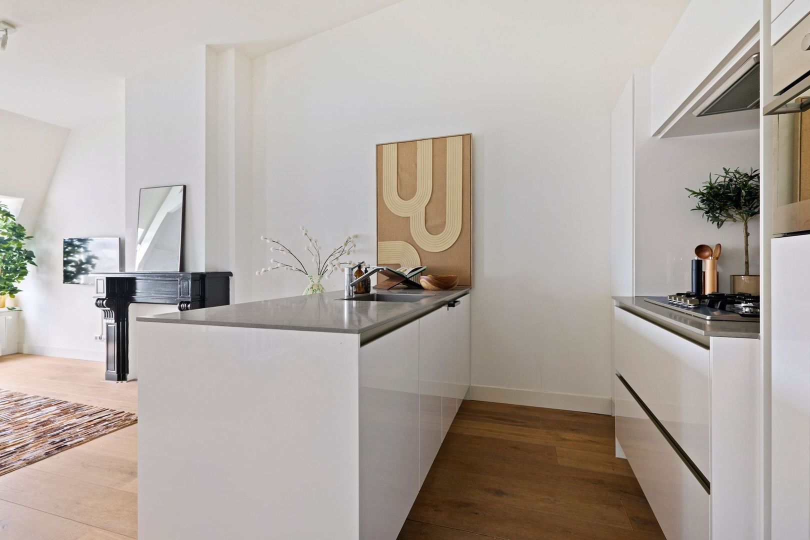 De open keuken is strak van uitvoering, beschikt over een spoeleiland en is uitgevoerd met witte kastjes en lades i.c.m. een donker natuurstenen aanrechtblad. De keuken is voorts voorzien van goede bergruimte en diverse inbouwapparatuur zoals o.a. een vaatwasser, 5-pits kooktoestel en afzuigkap.