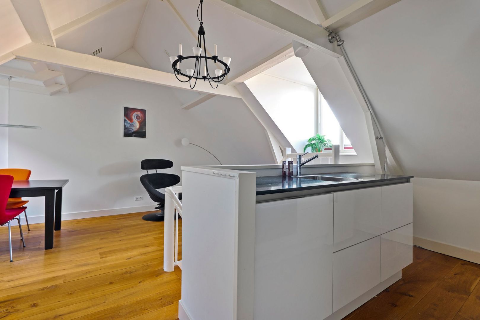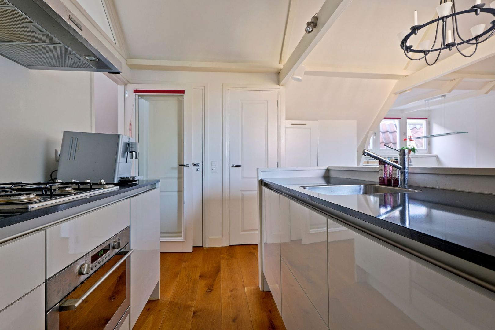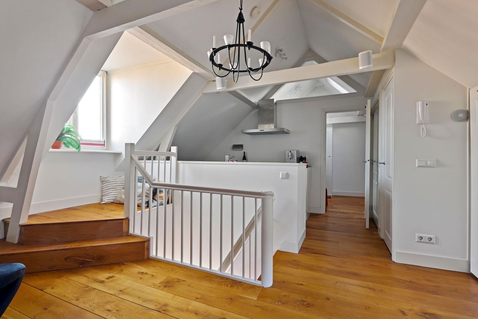 Via het lichte trappenhuis bereikt men de entree op de derde verdieping. De overloop, voorzien van de meterkast, biedt plaats voor een garderobe en heeft een beklede trap naar de vierde verdieping. De living biedt plaats voor zowel een eethoek als een zitgedeelte. De kleine verhoging aan de voorzijde is een ideale plek voor een gezellige leeshoek. De open keuken is aan twee zijden opgesteld en uitgevoerd met hoogglans witte kasten en een donker natuurstenen aanrechtblad. Voorts is de keuken voorzien van diverse inbouwapparatuur.