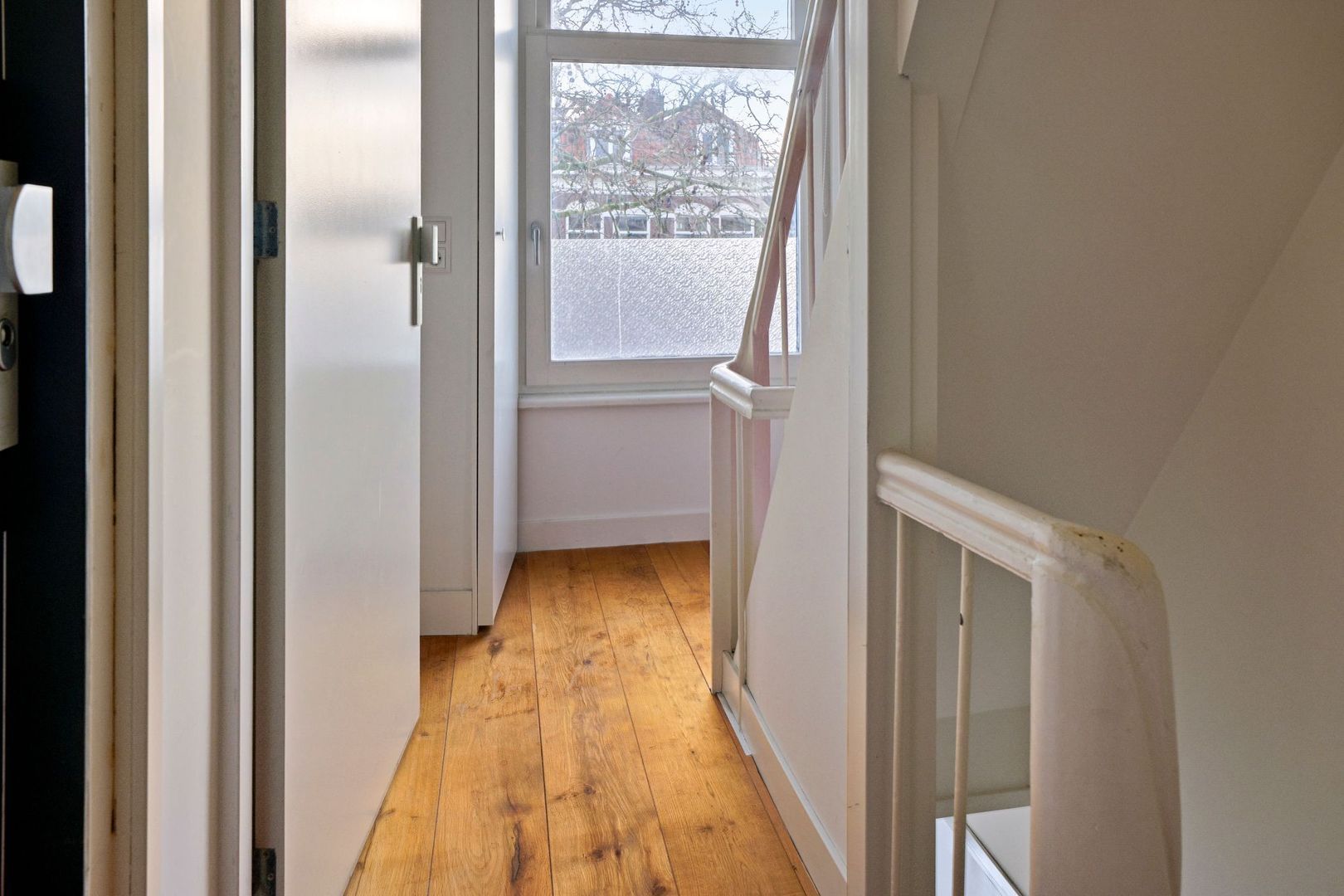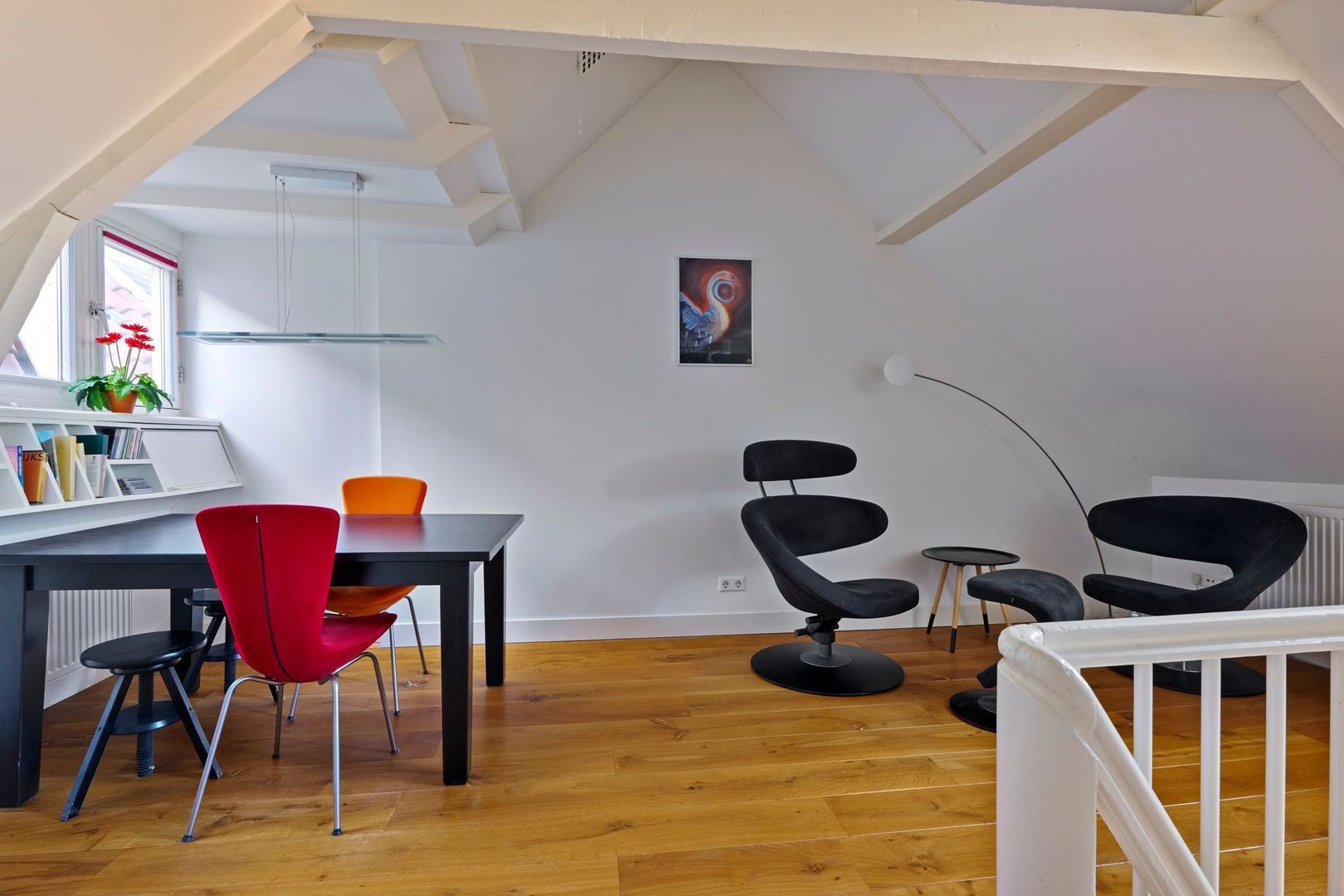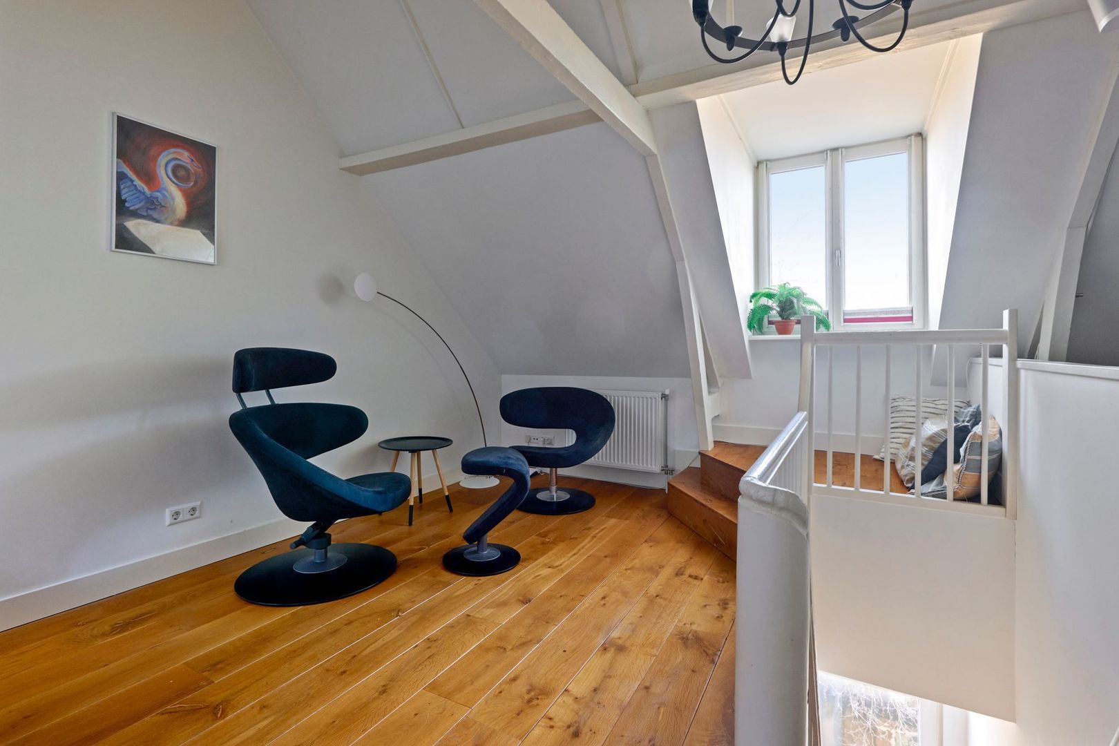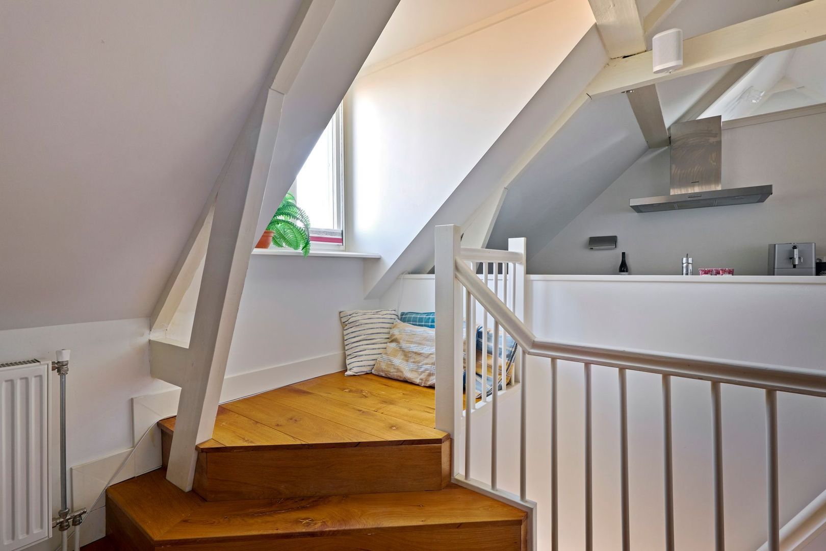 Via het lichte trappenhuis bereikt men de entree op de derde verdieping. De overloop, voorzien van de meterkast, biedt plaats voor een garderobe en heeft een beklede trap naar de vierde verdieping. De living biedt plaats voor zowel een eethoek als een zitgedeelte. De kleine verhoging aan de voorzijde is een ideale plek voor een gezellige leeshoek. De open keuken is aan twee zijden opgesteld en uitgevoerd met hoogglans witte kasten en een donker natuurstenen aanrechtblad. Voorts is de keuken voorzien van diverse inbouwapparatuur.