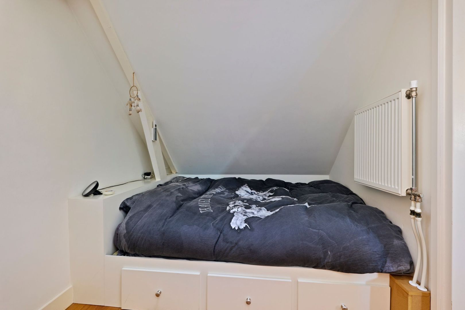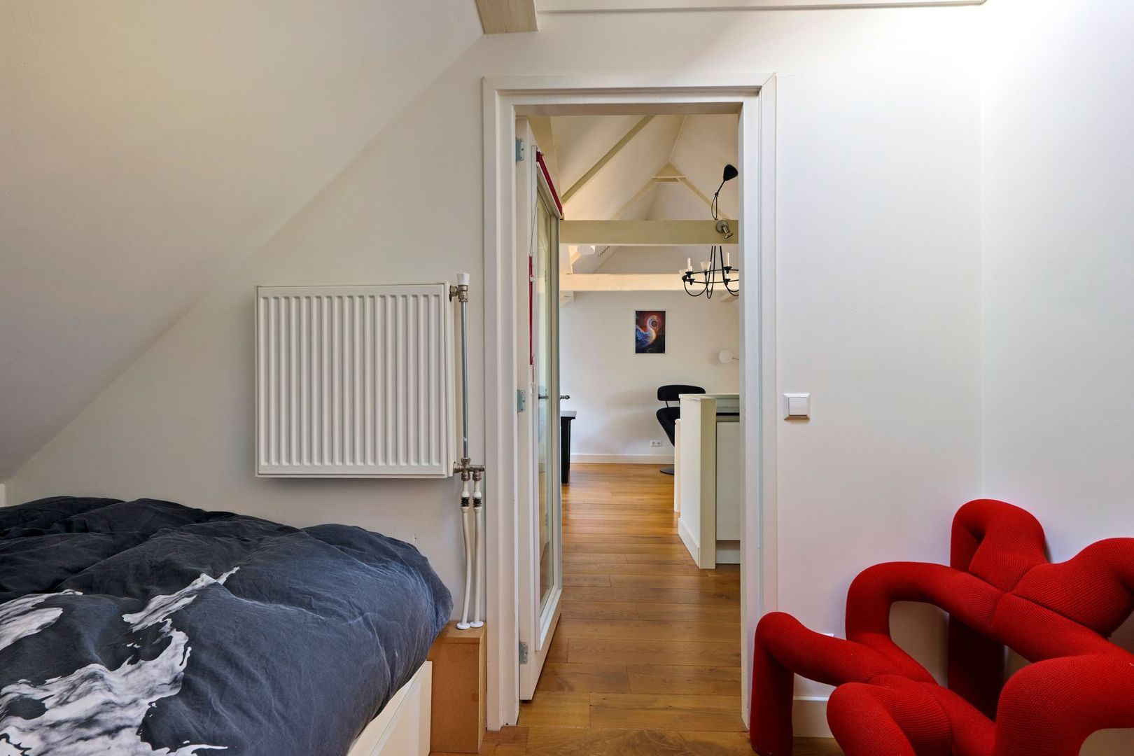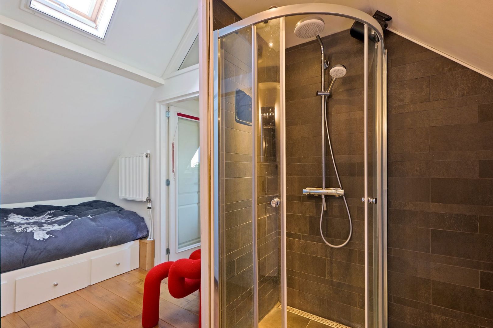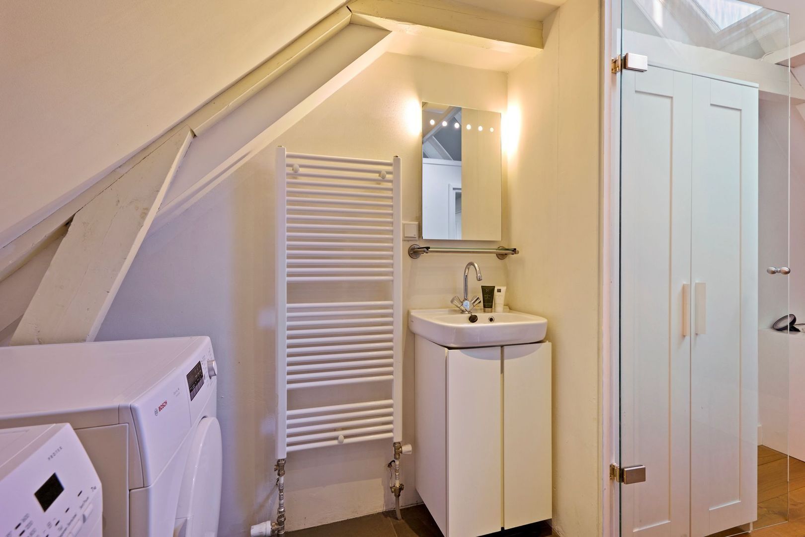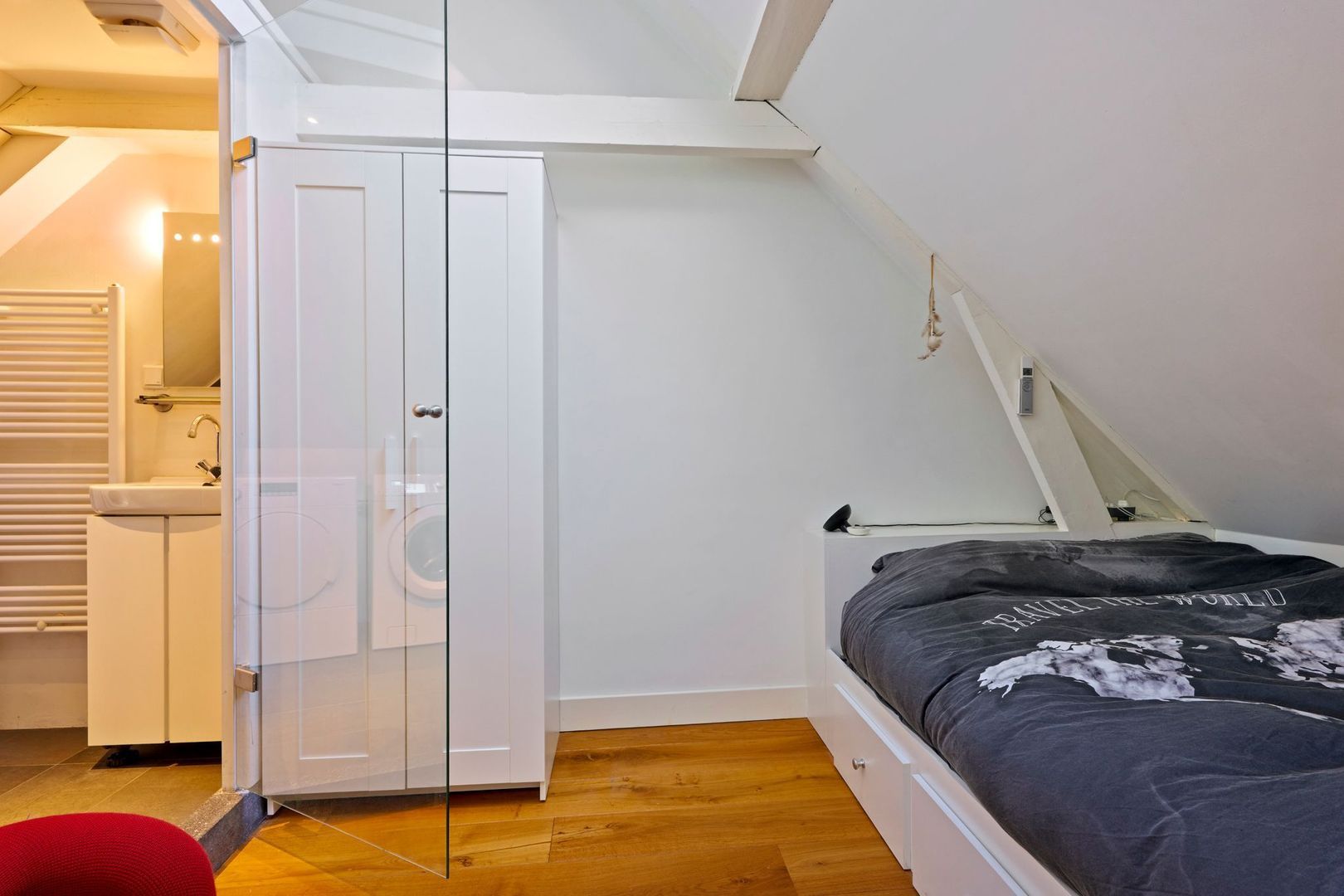 Tegenover de keuken zijn het separate toilet en de c.v. ruimte naast elkaar gelegen. Links van de keuken is de slaapkamer gesitueerd, bereikbaar via de elegante glazen deur. Deze kamer is voorzien van een tweepersoons customized bed met bergruimte en een elektrisch bedienbaar Velux dakraam met tevens een elektrisch bedienbaar rolgordijn. De en-suite badkamer is uitgevoerd met een grijze vloertegel met vloerverwarming in combinatie met een witte wand en een antracietkleurige douchewand. De badkamer biedt een douchecabine, compact wastafelmeubel en de wasmachine/drogeraansluiting.